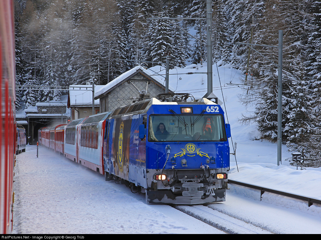 | Train 1128 coming from St.Moritz and going to Chur is leaving the 5866 metre long Albula tunnel in Preda. Ge 4/4 III 652 wears a promotion paint for Hockey Club Davos (HCD). On the lower part of the locomotive front, you can see that it was very cold the last night in upper Engadin, till minus 25 Celsius (- 13 F). The two panoramic cars in front of the train are going to Zermatt with the GLACIER EXPRESS. |