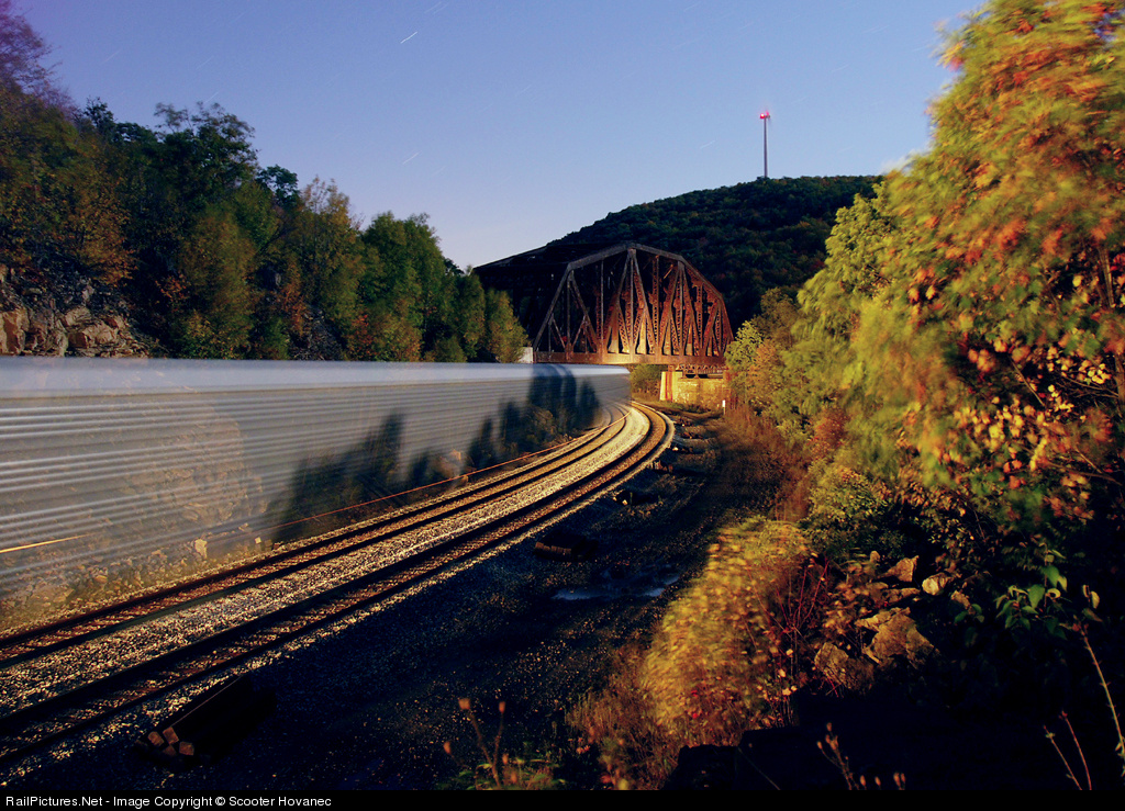 | The headlight of a lone SD70MAC illuminates the former Western Maryland Railway Keystone Viaduct. Completed in 1913, the Connellsville Extension of the WM was mostly abandonned in May 1976 after Chessie moved the WM traffic to former B&O rails. Keystone Viaduct was initially spared from the abandonment, remaining in service until the early 1990's to provide access to a loadout west of Meyersdale, today it carries only bicycles. |