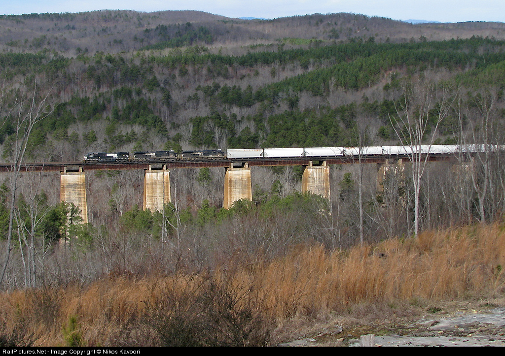 NS 153 manages to catch a spot of sun as it crosses the spectacular Wells Viaduct, west of Toccoa. The train has just picked up and set out cars in Toccoa and is now heading south to Atlanta, next stop Gainesville, GA.