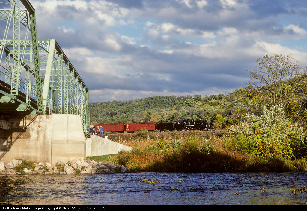 | #14 is in the lead of a photo freight passing the Runk Rd bridge (with numerous railfans on the other embankment) during the Fall Spectacular weekend. I remember my brother and I killing a lot of time between trains by throwing rocks in the river or dropping them through the open grate of the bridge floor. |