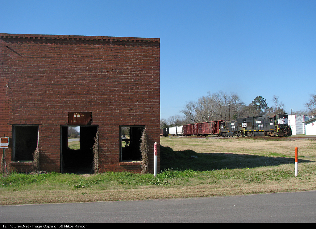 Georgia Central Y101 rolls past a derelict shell of a building in what can be considered downtown Montrose, GA.