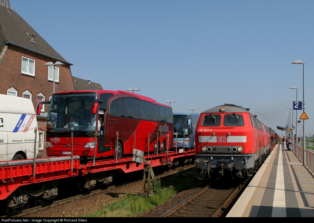 | 218 363 0 ~ 218 190 7 work a DB Autozug train from Niebull to Westerland at Keitum 7Jun07. It has just come off a single track section and the waiting Autozug for Niebull will shortly move off. Note that drivers/passengers stay in the vehicle for the duration of their journey by rail. |