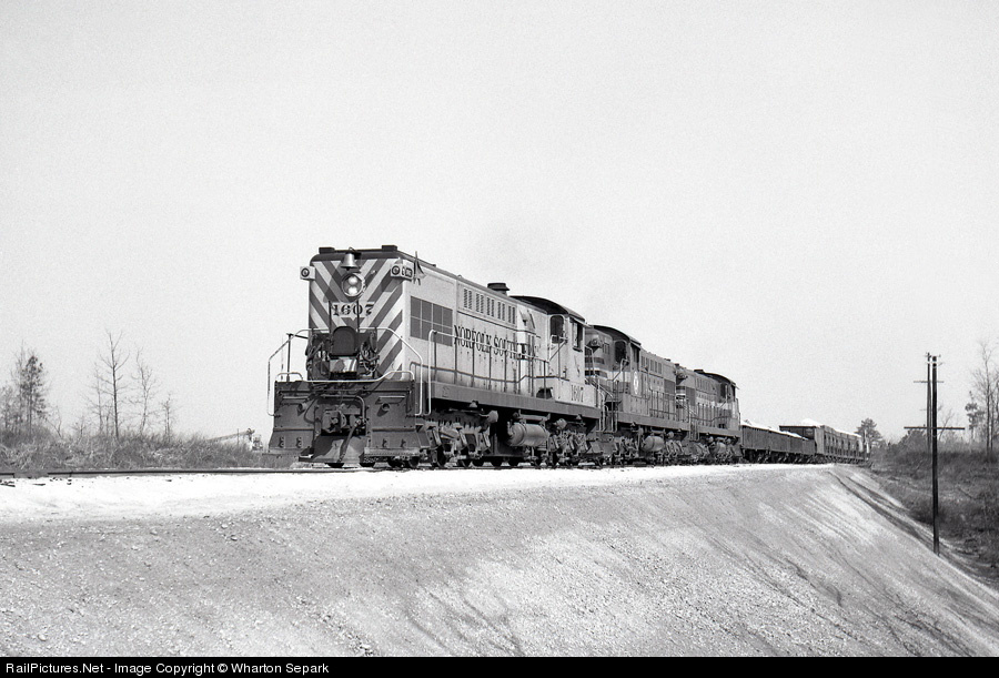 "Original" Norfolk Southern Extra 1607 South is working the Becker Sand & Gravel Co. pit near Lillington, NC on February 20, 1969. Three Baldwin AS416's are working the job today including two that are still in their original red paint. The BS&G Co. loading facility can be seen in the far distance beyond the lead locomotive.