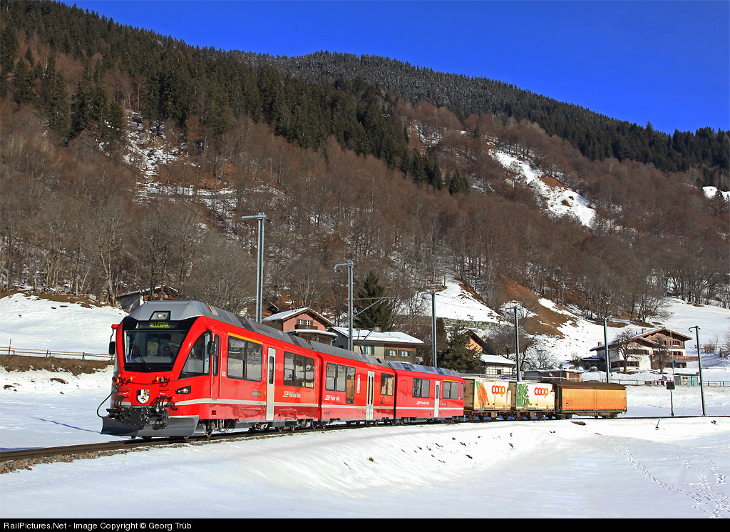 | New dual system trainset (EMU) ABe 8/12 3502 ALLEGRA with the freight 5336 Zernez-Landquart for driver training. ALLEGRA on the front destination panel means hello or welcome in the local language. |
