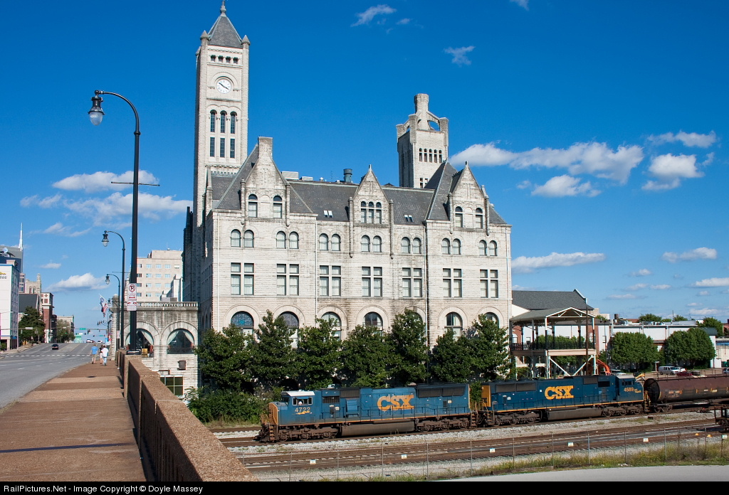 | CSX Q535 passes the Nashville Union Station and is about to duck under Broadway, unfortunately the second unit, CSXT 4589 the “Spirit of Nashville” was not leading. |