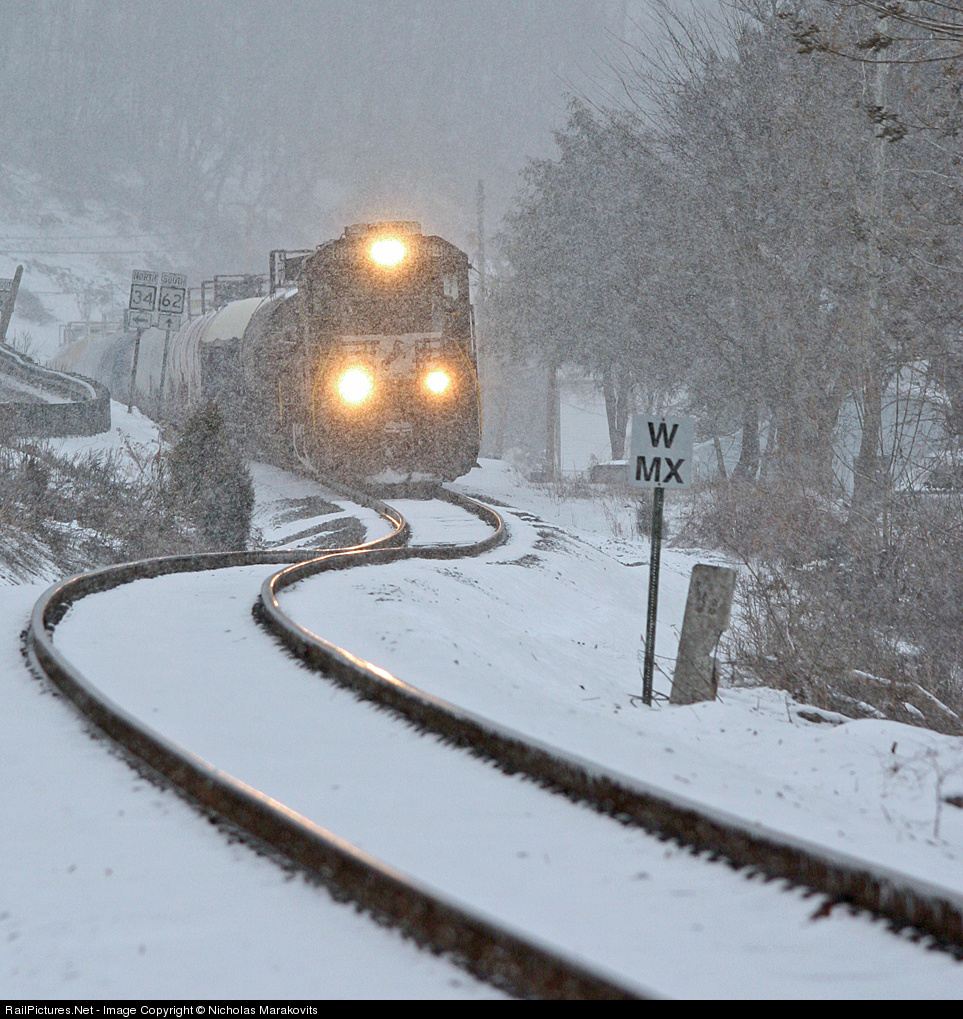 My 70-300mm lens helped eccentuate the unlevel trackage as NS 381 makes its northbound trip as another snow storm moves into the Kanawha Valley.