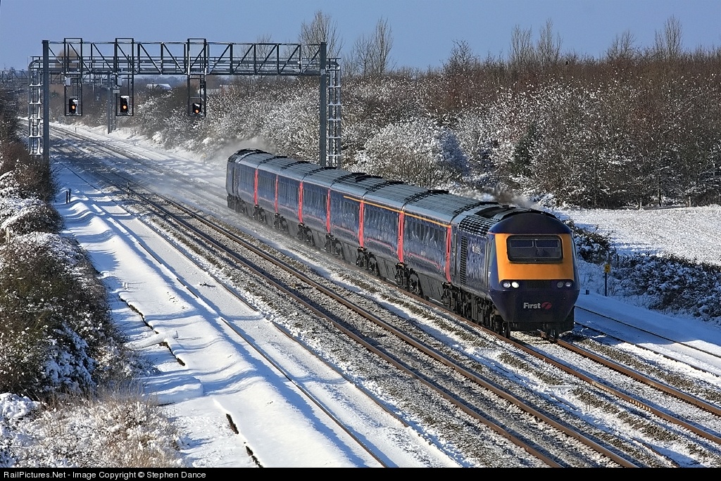 | Despite the freezing temperatures I couldn't turn down an opportunity to take some shots with sun on snow, although I only managed an hour or so before I began to lose all feeling in my feet. AN FGW HST speeds past the bridge at Circourt with a Paddington bound working. As it has been some days since the last snowfall, most of the powder on the main lines has been blown away by passing trains. Earlier in the week there were spectacular clouds of flying snow |