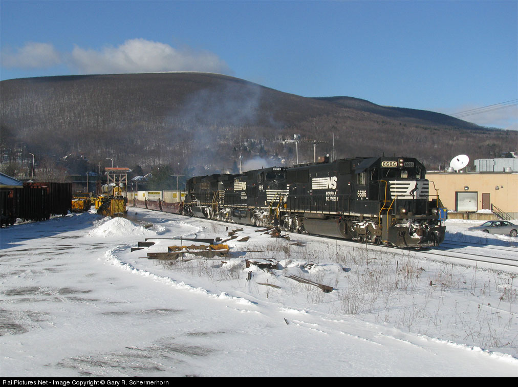 | New Year, New Train. Pam Am Southern MOAY(NS #934) passes through North Adams as it approaches Hoosac Tunnel ahead on a frigid, sunny Saturday. This is a new run-through train(retaining the older MOAY symbol) begun by NS on Friday delivering autoracks and intermodal to Ayer Mass. |
