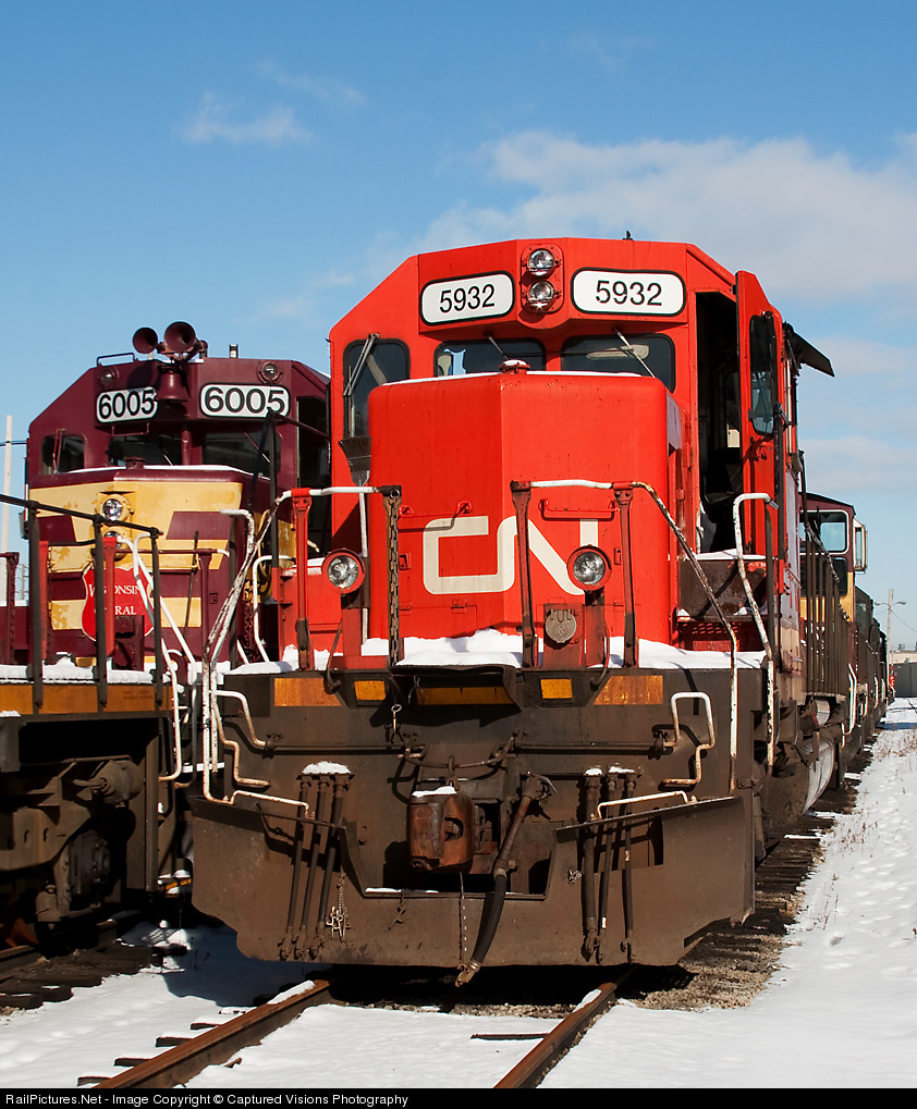 | On the 2nd day of the new year, CN 5932 sits stored on the deadlines outside the shops at Homewood. The WC unit next to it, is one of the two remaining SD40-2's that came from the WC. |