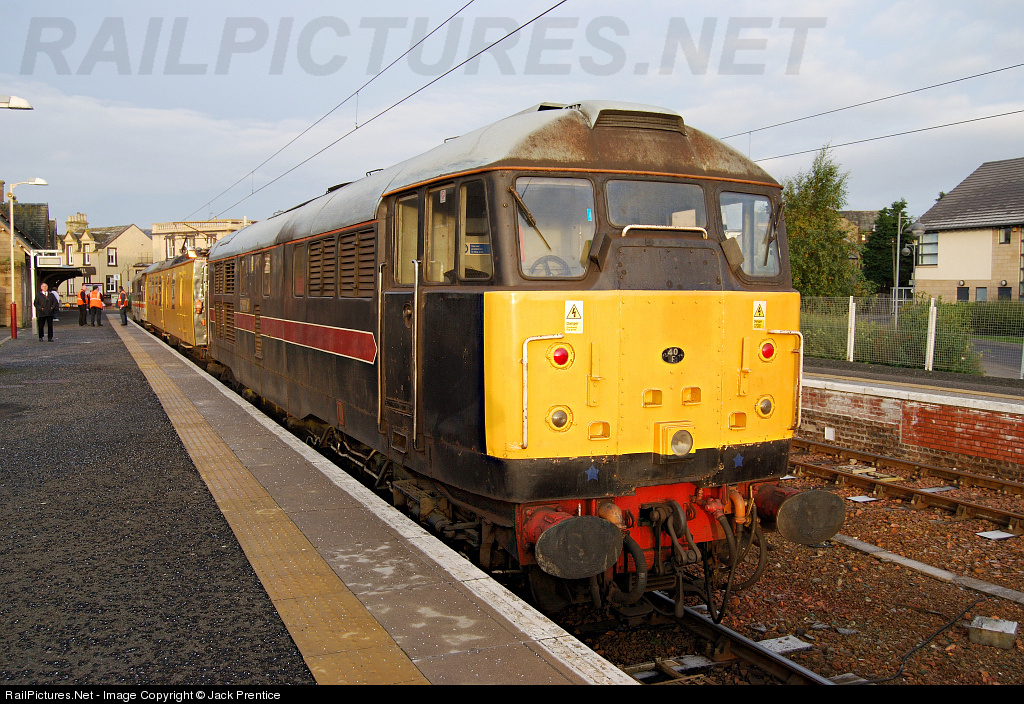 | Fragonset-liveried 31106 stands in Lanark (30 mile South of Glasgow) with the Network Rail Mentor coach that is used to test the over head lines, This train was booked to go round the Glasgow subbian lines that had OHL, 31106 has since been painted into BR Blue livery |