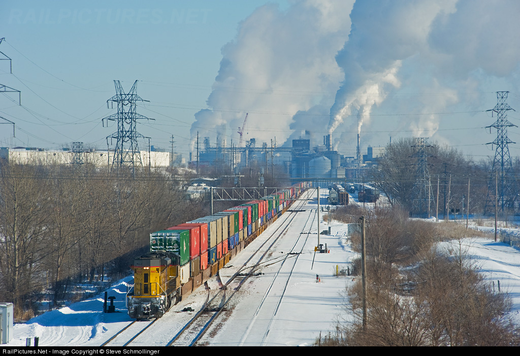 | With the temperature below zero, an eastbound UP stack train heads for a crew change as the ADM plant pours out towering columns of steam. |