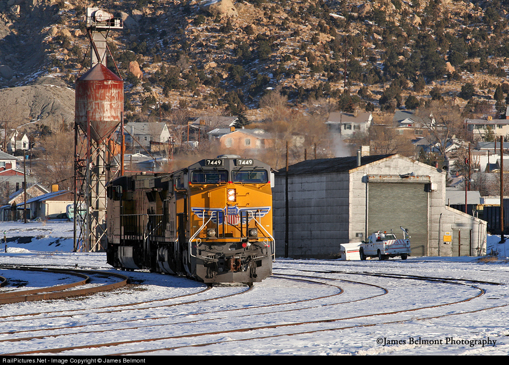 Union Pacific's HHEHE-08, called to duty before sunrise on the morning of January 8, 2010, awaits a westward departure spotted in front of the former D&RGW depot at Helper, Utah. On account of cold weather problems, the MRONY's departure east from Roper yard in Salt Lake City was severely delayed. It is uncommon for UP to assign a new ES44AC to swing helper service on the Provo Subdivision.