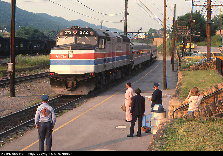 A couple of train watchers and crew members, but no revenue riders, are on hand in Bluefield, WV, as Amtrak's westbound Hilltopper arrives. The April 30, 1978, timetable shows train departure at 7:10 p.m. Stops at Welch, Williamson, and Catlettsburg ("Tri-State Station") lie ahead.