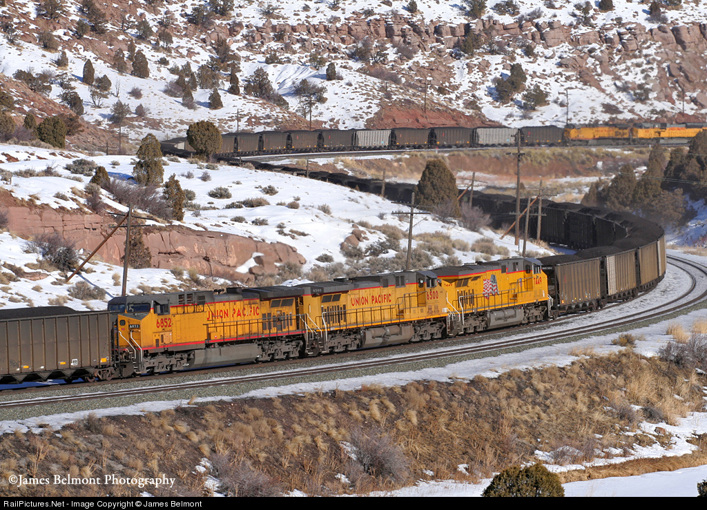 Union Pacific's maned 'Helper Helper' pushes and pulls a Savage, UT to Trona, CA coal train through the 's' curves just west of Kyune. Visible at the tail end of the train is a pair of DPU's offering an additional shove. All in all, two AC's are on the point, three in the middle, and two on the rear.