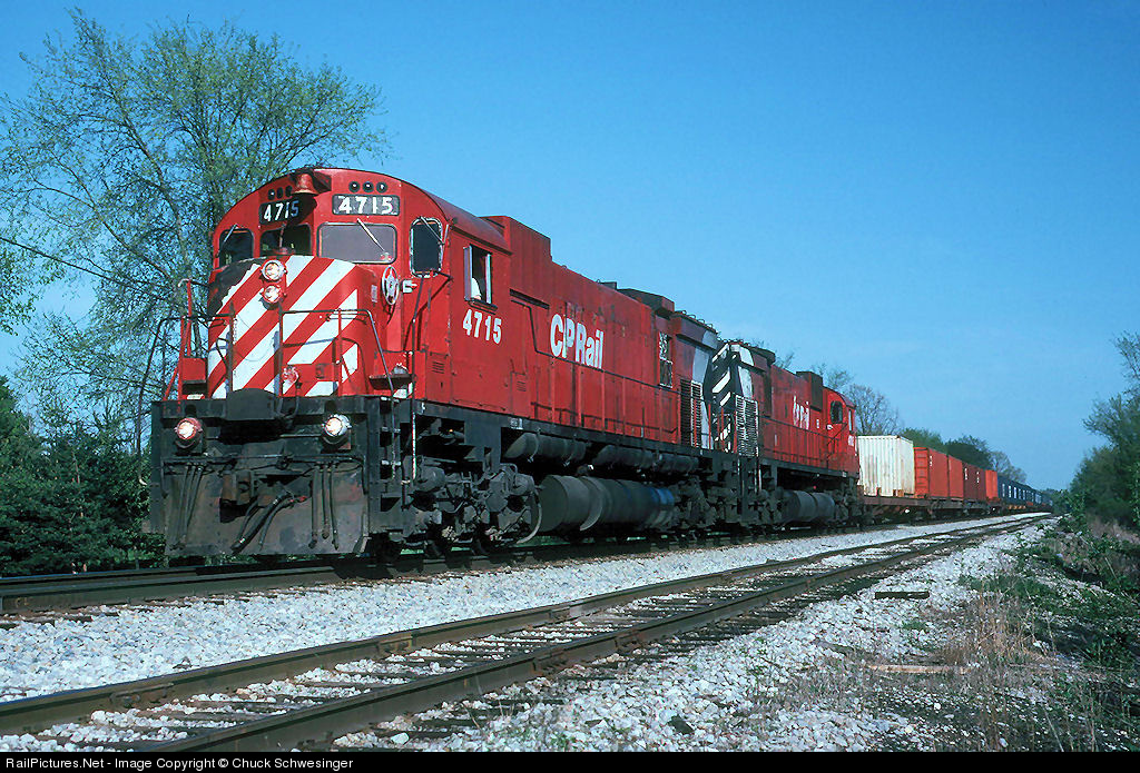 | CP 4715,4705 have come to a stop at West Williamston to wait for an eastbound to take siding so they can proceed to the west with the COFC traffic on train #503. Long after US roads had retired Big Alcos the CP and CN continued to run fleets of them in all kinds of service across eastern Canada. Its hard to say if the CSX crews that operated these even remembered the four C&O C630's that once frequented these rails years before. |