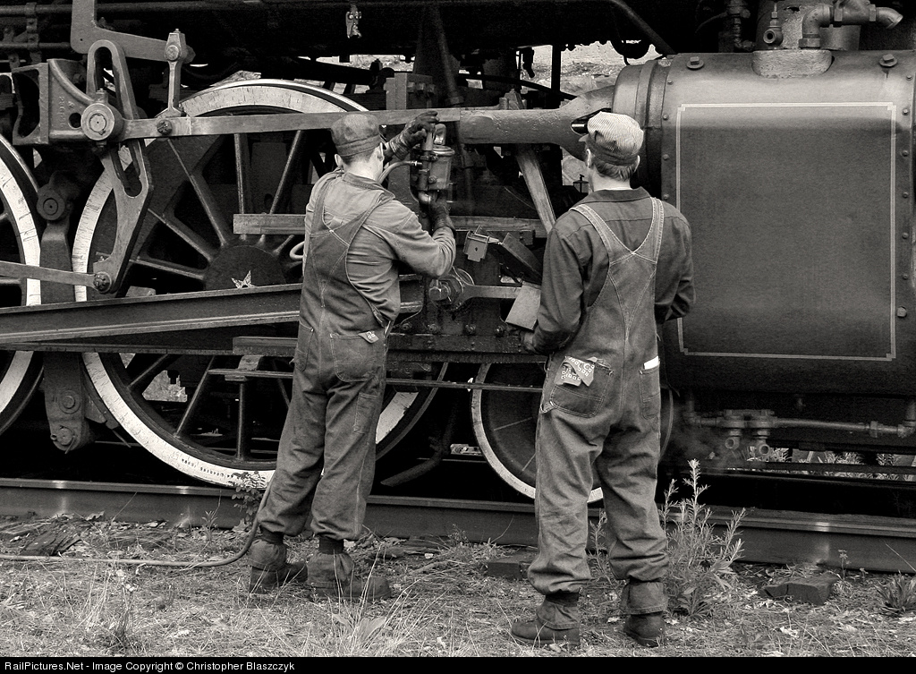 Two crew members work the grease gun to lubricate the engine's bearings during the lunch stop at Jim Thorpe.
