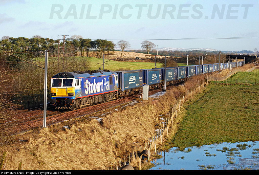 | Stobart Rail / Deutsche Bahn Schenker 92017 ''Bart The Engine'' heads the 4S43 Rugby (Central England) - Mossend (Glasgow) North past Ravenstruther, The train conveys goods for 1 of the big supermarket chains in the United Kingdom called Tesco |