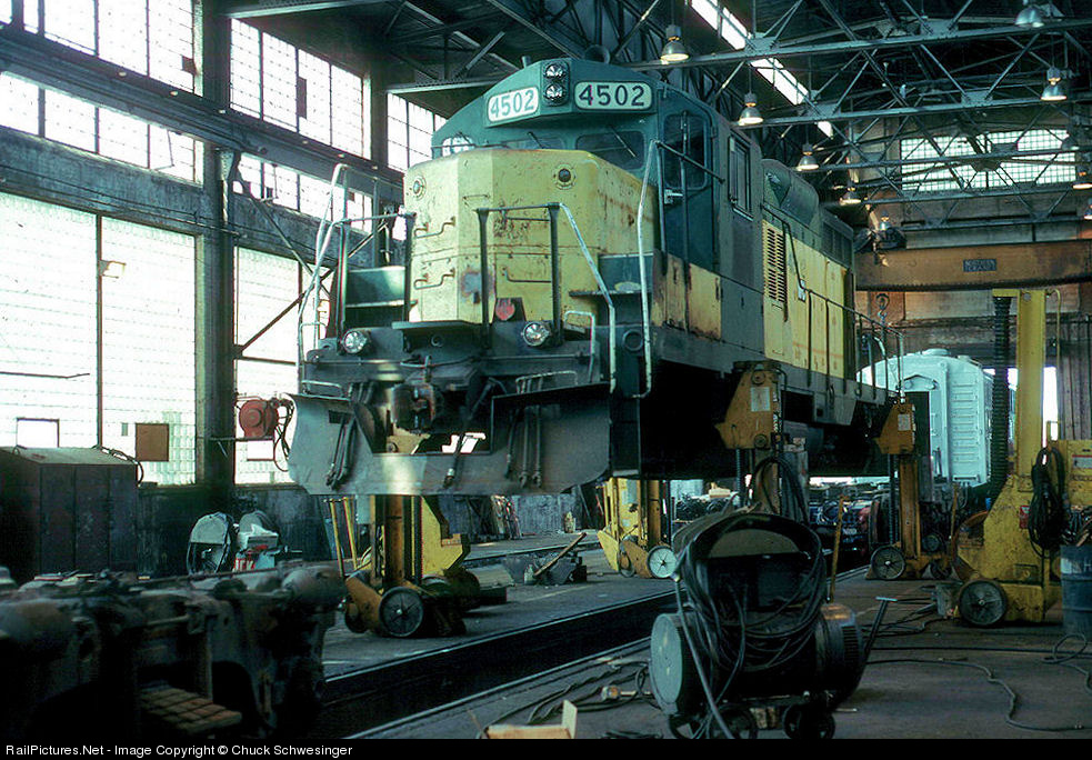 WC 4502 is waiting for the day shift to arrive and fit her with a set of rebuilt trucks inside the ex ACR shop at Steelton. In the background you can spot a freshly paint FP9 being made ready for canyon service.
