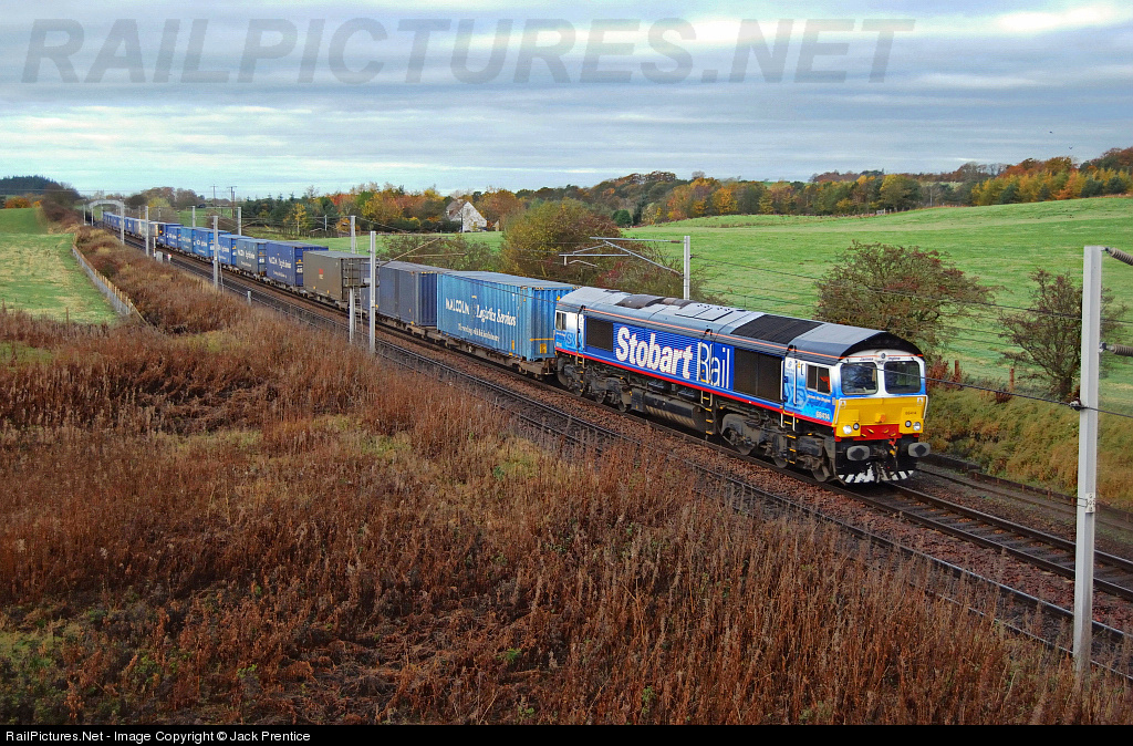 DRS/Stobart Rail 66414 ''James the Engine'' heads the 4M44 Mossend (Glasgow) - Daventry (Cental England) South past Ravenstruther