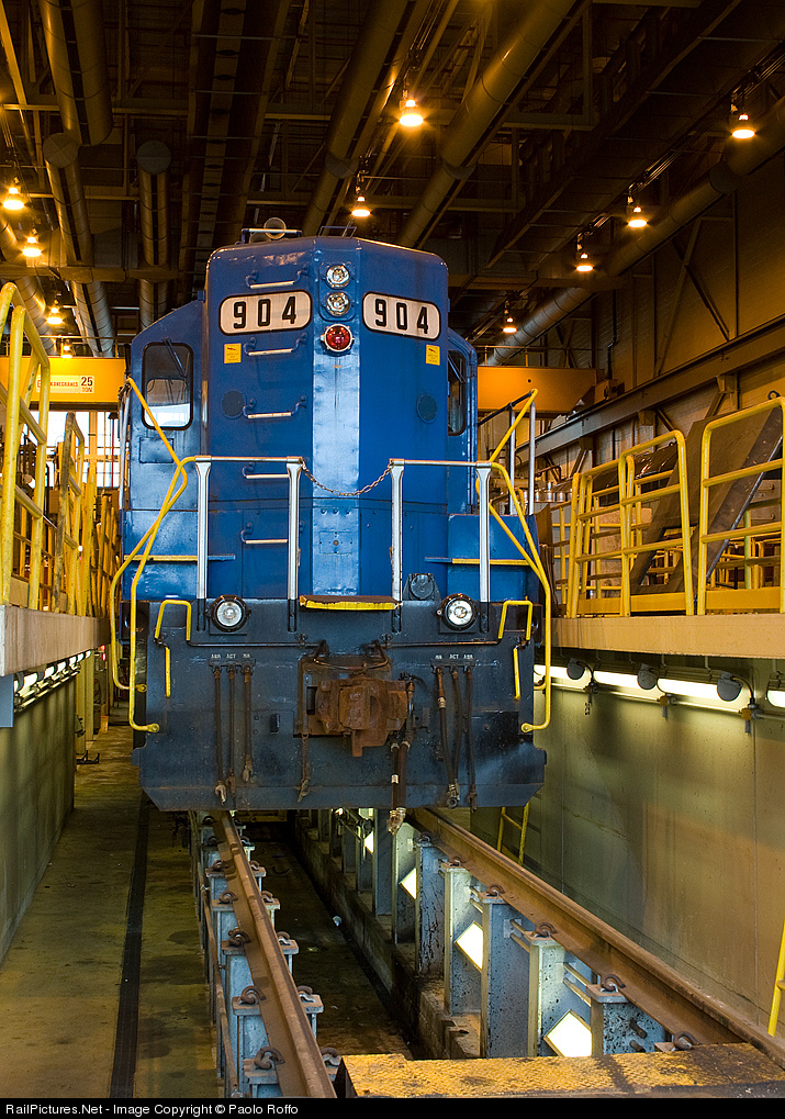 | Beginning life as a GTW GP18, MBTA 904 migrated to Detroit commuter service before winding up in Boston during the MBTA's formative years. With most of her sisters retired and sold, 904 is still on the roster. But with two new Gensets on the property, whether she gets repairs to her leaking oil cooler and gets back on the road is anyone's guess. |