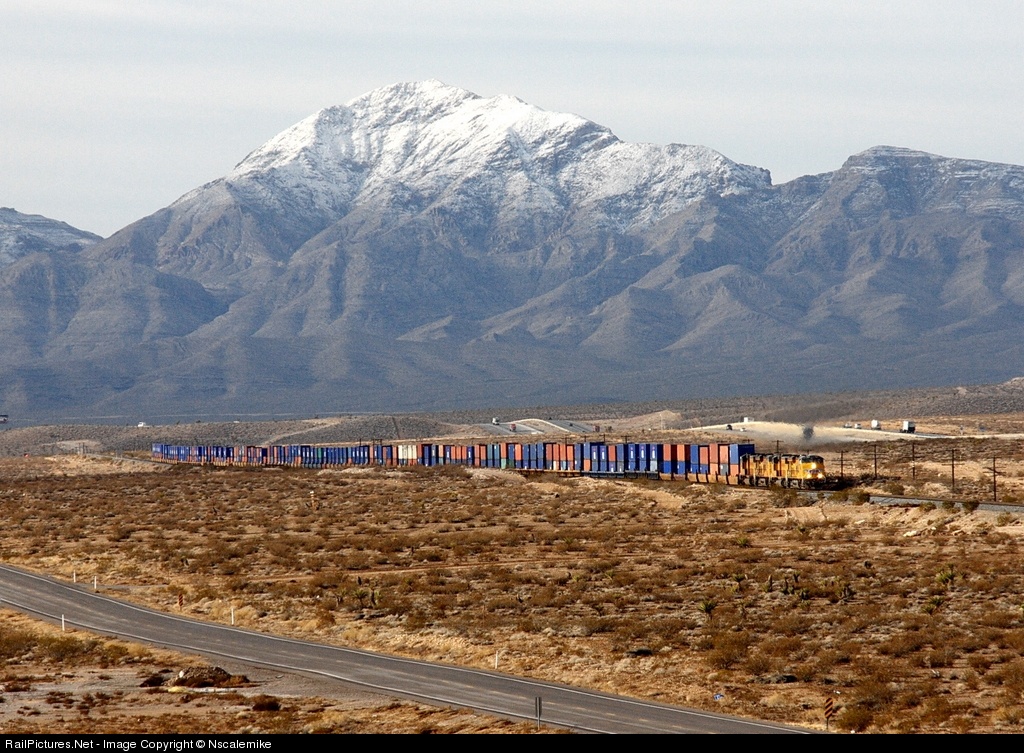 This is an eastbound stacker ascending the grade at Erie Nevada. The southern end of the Spring Mountain range provides the backdrop.