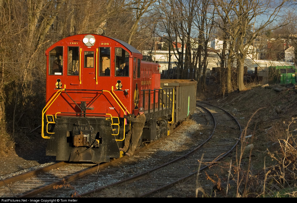 The Columbia & Reading Railway (CORY) conductor rides on the steps of the Alco S2, prepared to hop off to flag the 4th Street grade crossing. The crew is bringing two loads of scrap to the interchange with Norfolk Southern in downtown Columbia. This was the first revenue move on this former Reading branchline in approximately 20 years. These trips to the interchange will also be the only time to view the Alco as it is parked in a secure, locked and patrolled location when not in use.