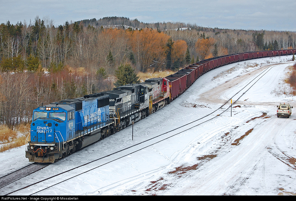 | A rare ex-Conrail blue unit makes an appearance in northern Minnesota as the leader of an All-Rail train shown coming down off the hill from U.S. Steel Minntac with 103 loads of fresh baked taconite pellets bound for the U.S. Steel Edgor Thomson Works facility. Note the CN track inspector truck on the right waiting to jump on and follow this train. Conrail, Norfolk Southern and Santa Fe paint schemes along with a CN truck. |