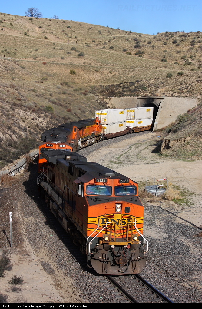 | BNSF train Z STOWSP8 15 exits Tunnel #3 on it's 3,600 foot climb from Bakersfield to Tehachapi. Running over UP trackage rights as 8ZSTWSJ 15, the dispatcher ran it around a slower UP freight at Bealville siding. |