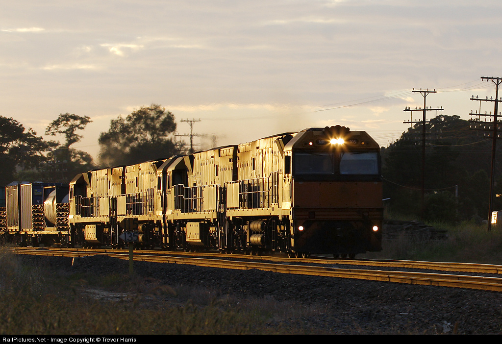 | NR105 leads NR69,64 & 72 on a Brisbane-Melbourne freight as the sun begins to rise for the day,Nice golden light from sunrise shines on the side! |