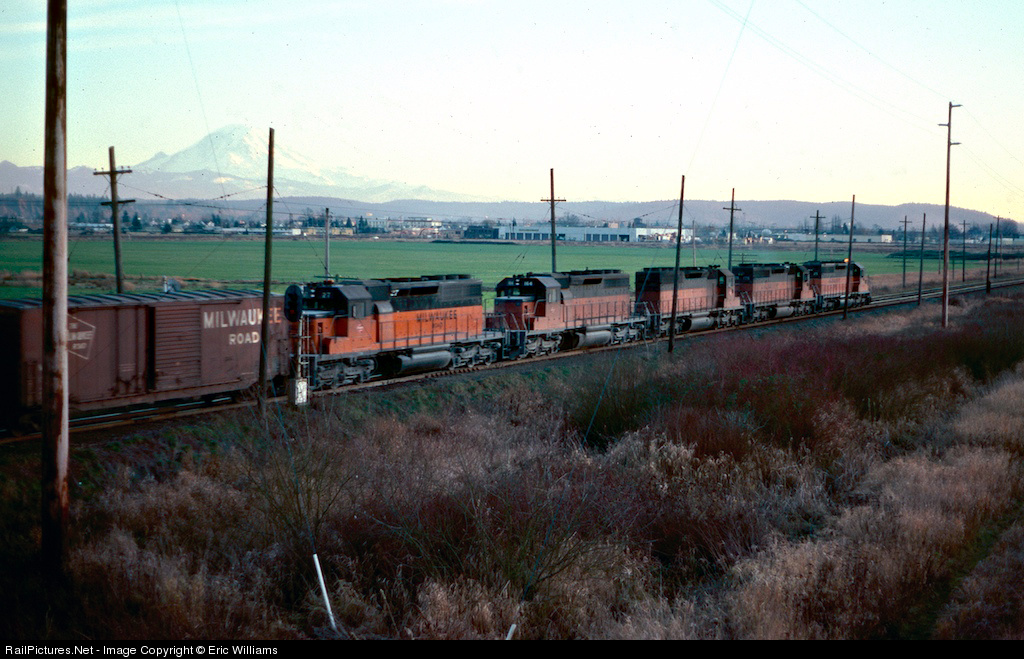 On a rare clear Fall day, the last sun of the day lights Mt. Rainer while Dead Freight West hurries to Tacoma pulled by five SD40-2’s, #25, 175, 137, 164, 27. This section of railroad through the Kent Valley was jointly owned by the Union Pacific and is probably the best track this train traversed in several days during its long transcontinental journey.