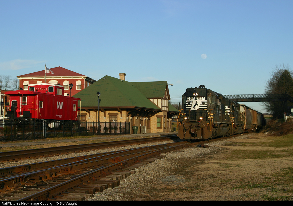 Let's call this one "Shootin' the moon in the afternoon". Our enlightened town leaders and others have slowly created a great photo venue with the passenger station, the old store, the station, the caboose, an 1957-original N&W house and the great pedestrial overpass. Thanks everyone. Here V40 is just heading west to Bristol after switching Light Milling. And that is Luna herself over the unit. Check your star charts.