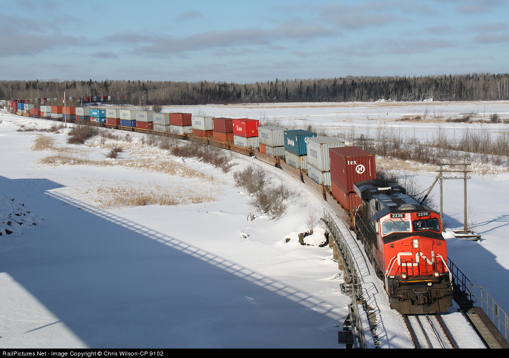Curving around past the connection to the abandoned Kinghorn Sub, and across the frozen Kenogami River, containers from the Port of Prince Rupert roll east.