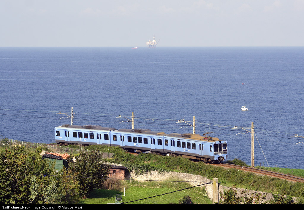 A 3500 in charge of a train Bilbao-Bermeo. In the sea (Atlantic Ocean) you can see a Gas Platform, La Gaviota.