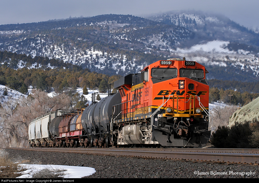 | BNSF 5959, a distributed power unit, trails the daily Denver, CO to Provo, UT manifest through Spanish Fork Canyon approaching CP RG672, Narrows. |