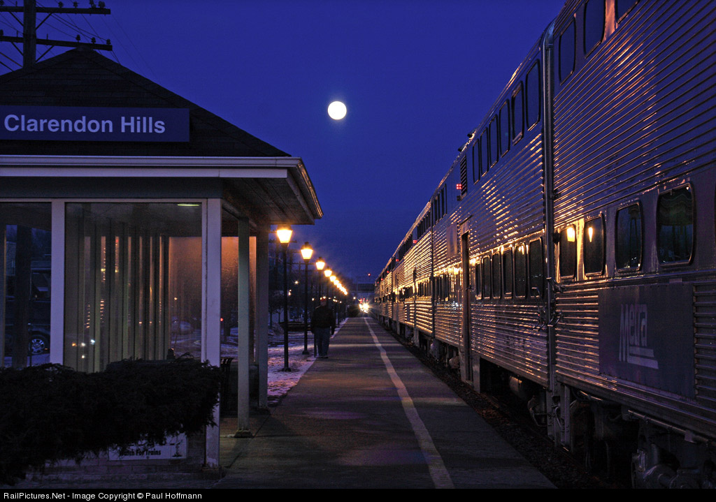| "Next stop, Clarendon Hills." WB Metra 1249 stops under the rising moon as two trains are seen back a mile or so. The train has just stopped and the doors are about to open as indicated by the red lights above the car doors at engineer's level. |