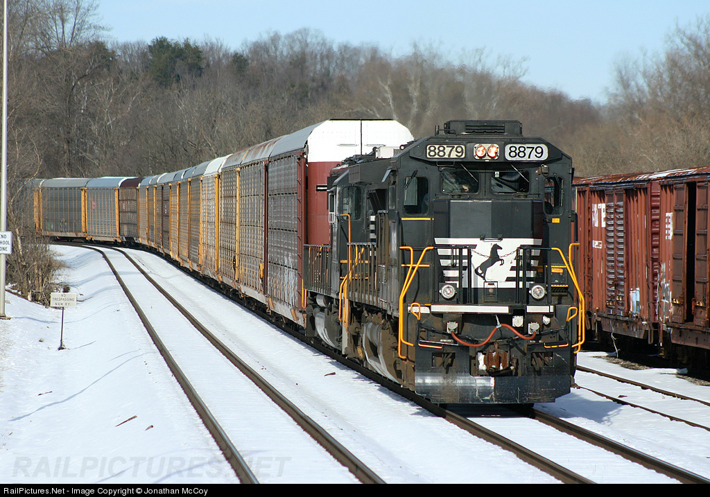NS 25N rolls into snowy Bristol with a classic consist of a tophat C40-9 and a SD60. Check out the mismatched numberboards on the 8879.