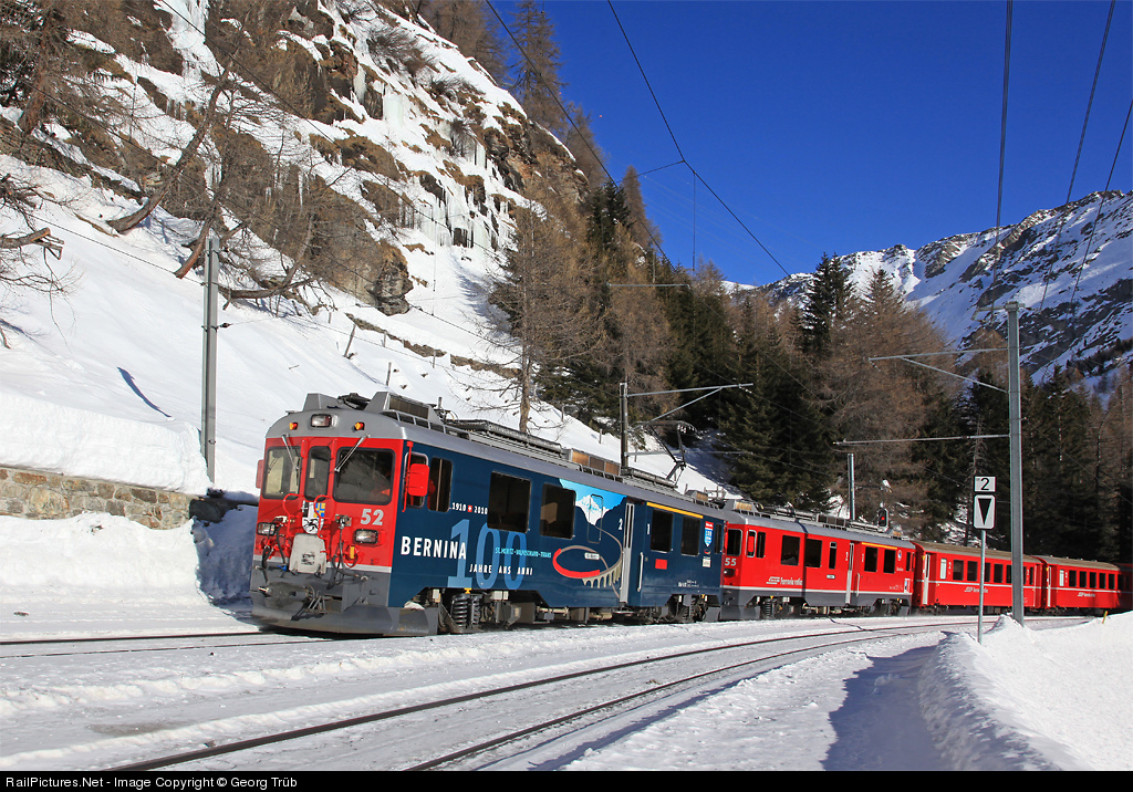 | The Bernina line from St.Moritz to Tirano, crossing the Alps under open sky on 2253 m a.s.l., is 100 years old now. ABe 4/4 52 got a special paint showing the spiral viaduct of Brusio. Train 1636 from Tirano to St.Moritz is passing Stablini, a crossing station between Cavaglia and Alp Grüm. |