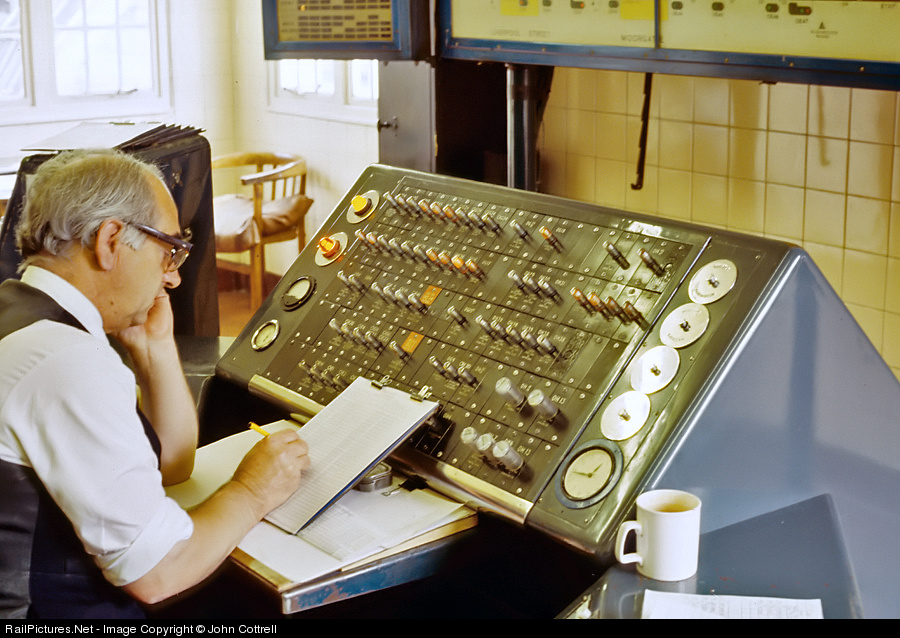 | Signal Operator at work in Farringdon cabin. Despite the modern push-button panel, train booking is still done by hand on pre-printed sheets. |