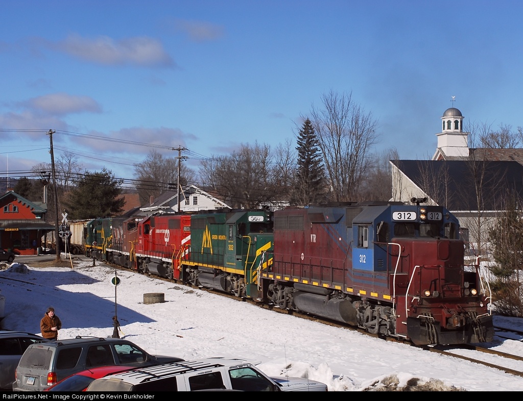 The 52-car Sunday extra salt train is operating through Chester, passing structures built in the late 1800s, on its way over the Vermont Rail System to New England Central delivery at Bellows Falls with VTR GP40-3 312, GMRC GP40 302, CLP GP40-2 306, VTR GP40-2W 311 and GMRC GP40 305.