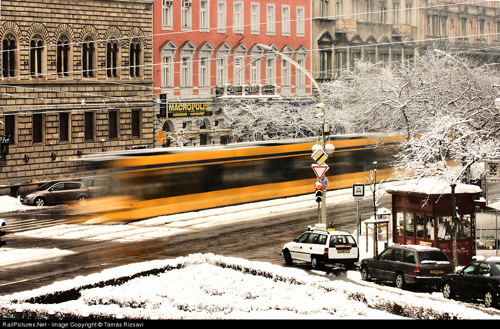 | Snow running in the center of Budapest...The longest tram of Europe is the Combino. (Now: Snowbino) The snow is falling on today in the city. The people choose the BKV than their cars. You can see the famous square in the picture which is the Oktogon. The tram goes across in the crossroads of the big boulevard and Andrássy út. This place is encounter dot in Budapest. |