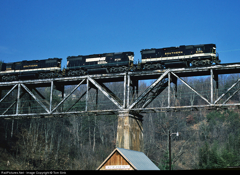 GP38-2 5170 still sports its Southern paint as it leads two other GPs over a trestle on the Asheville-Canton, NC line.