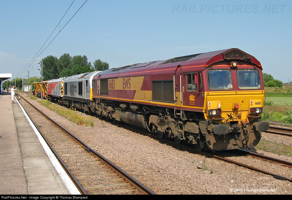 | 66113 and 67029 sit at Ely with 6Z79, the Derby-Norwich-Derby brake test for Network Rail's new point transporter wagons. |