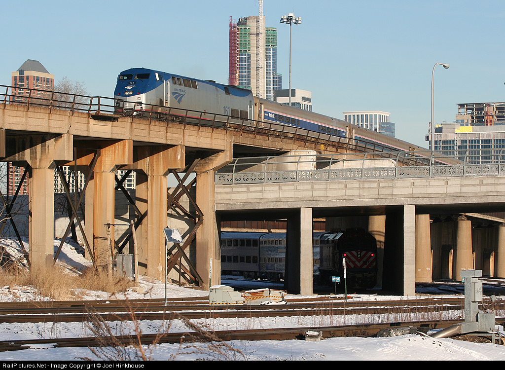 | The inbound Saluki hits the hump in the St. Charles Air Line that helps it clear Canal Street, which in turn is over the Canal Street Wye. Below, a Metra train awaits the afternoon rush. |