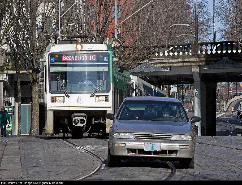 Perhaps one of the more interesting photos from my Portland adventure. The driver of the Nissan, after cutting off a MAX LRV and wondering why there might be a light rail vehicle in its own restricted lane, tries to speed away from the accelerating train as it blares its horn. Perhaps the best part of this picture is the look on the mans face, looking at the LRV in his rear view mirror, while his wife is scared and yelling in the passenger seat.