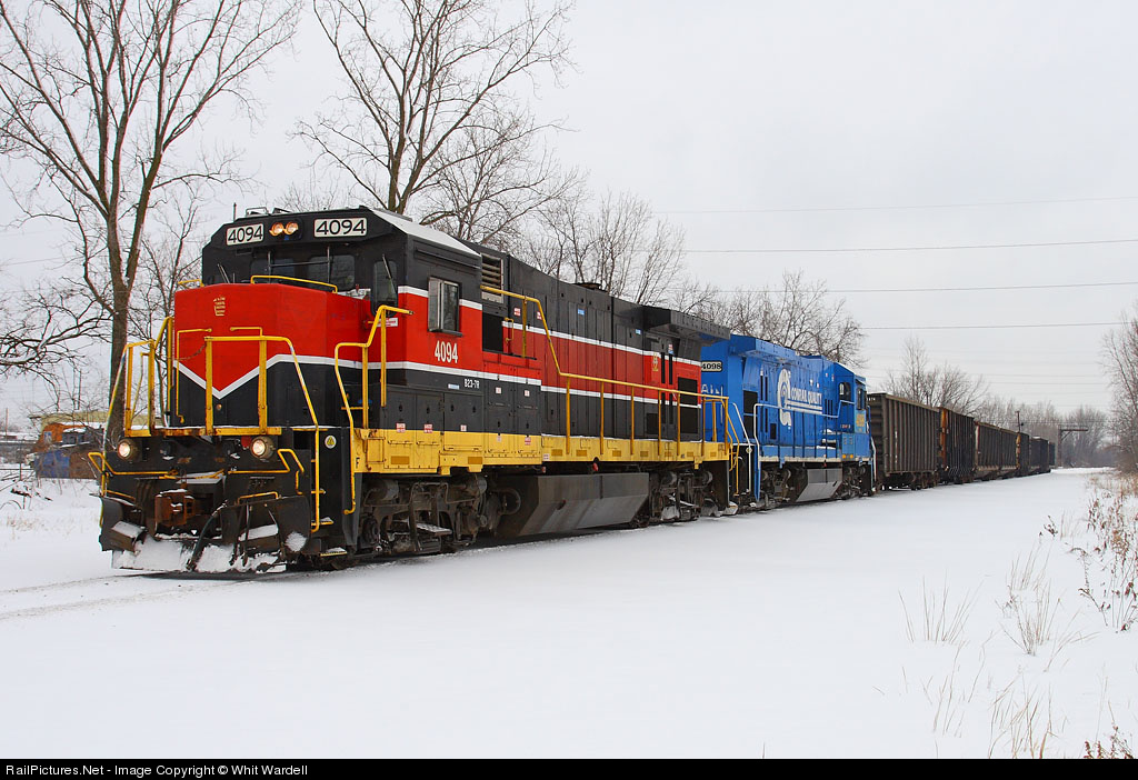 | Ohio Central 4094 and 4098 return from Joyce Iron & Metal down a remnant of the former CA&C. No less then 5 paint schemes are worn by the OC's 9 Super 7's, with 4094 getting it's colors from the short time it spent on the New Castle Industrial Railroad. |
