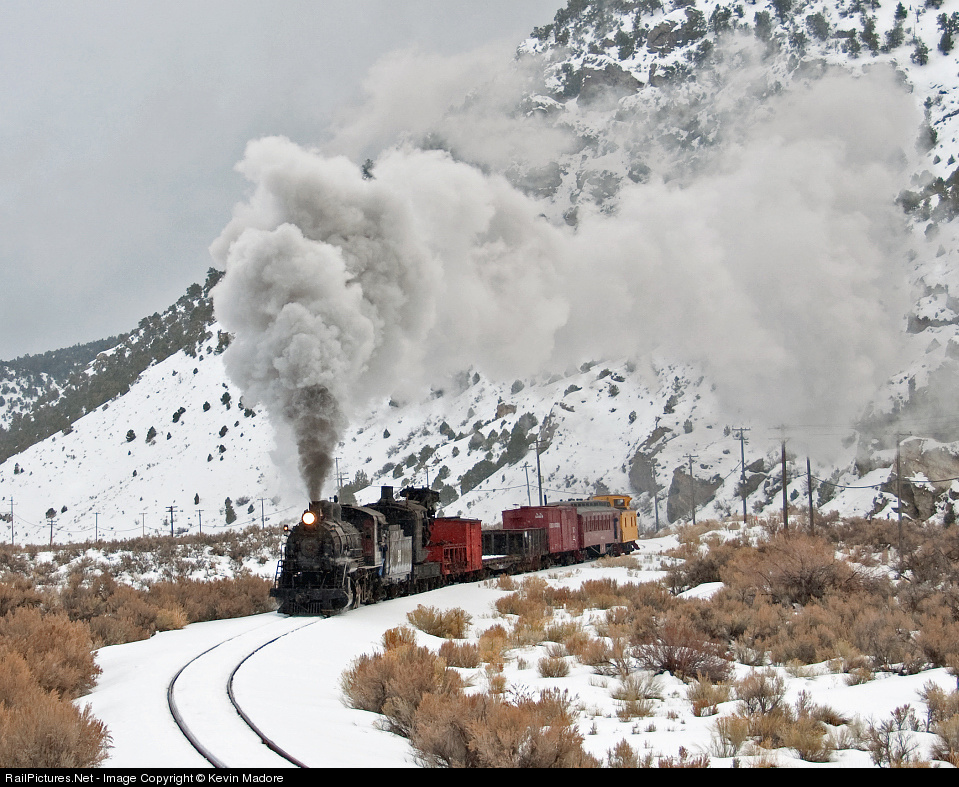 Big Hook headin' for the mines! Nevada Northern's heavy freight locomotive #93 barks mightily as she hauls a wreck train up the 1% grade from Robinson Canyon toward the abandoned mining town of Lane City. The line's most photogenic train consists of the 100-ton Steam Crane A, the crane's tool car, a flat, a ballast hopper, a wooden box car, an outfit car (converted combine) and a bright yellow caboose.