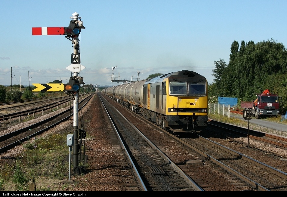 EWS (Now DB Schenker) 60068 approaches Barnetby Station on a rake of Large Bogie Tank Wagons. The Semaphore signals make this a avery pleasing picture.