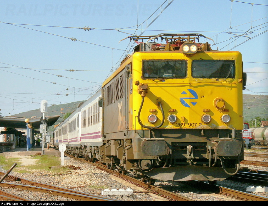 From Basque Country bound to La Coruña and Vigo; the Intercity train depart Monforte Lemos with a Japanese locomotive 269 class. Since 2008 these service it`s making with Arco coach and the powerful German locomotive 252 class.