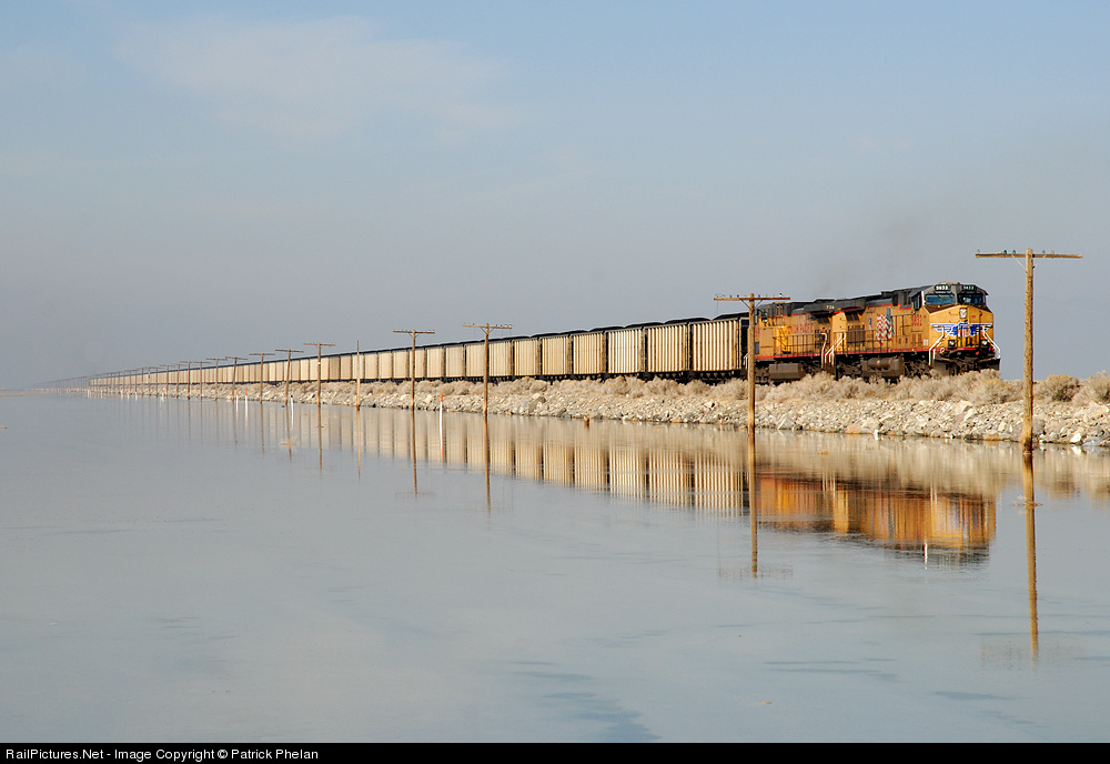 | UP 5832 serves as one of the DPUs on WB coal loads on the former Western Pacific main across Utah as they skirt the southern edge of the Great Salt Lake. The track is awfully straight here, vanishing into the fog in the distance. |