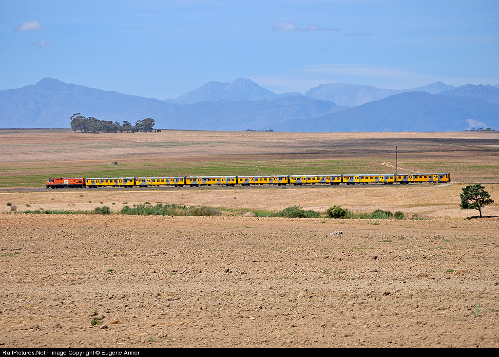 The 13:50 Saturdays only Metrorail train from Cape Town trundles down the grade from Fisantkraal to its next stop at Mellish. This is wheat growing country and the first signs of new green shoots are visible behind the train. The blue mountains of the "Boland" (uplands) form a distant backdrop.